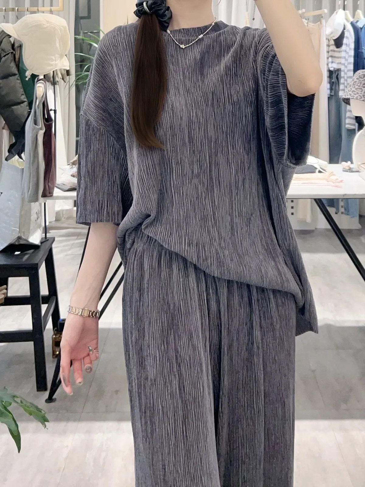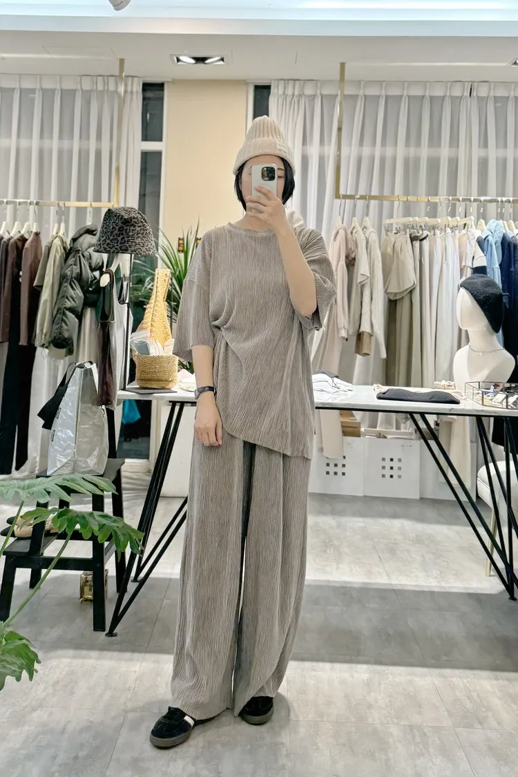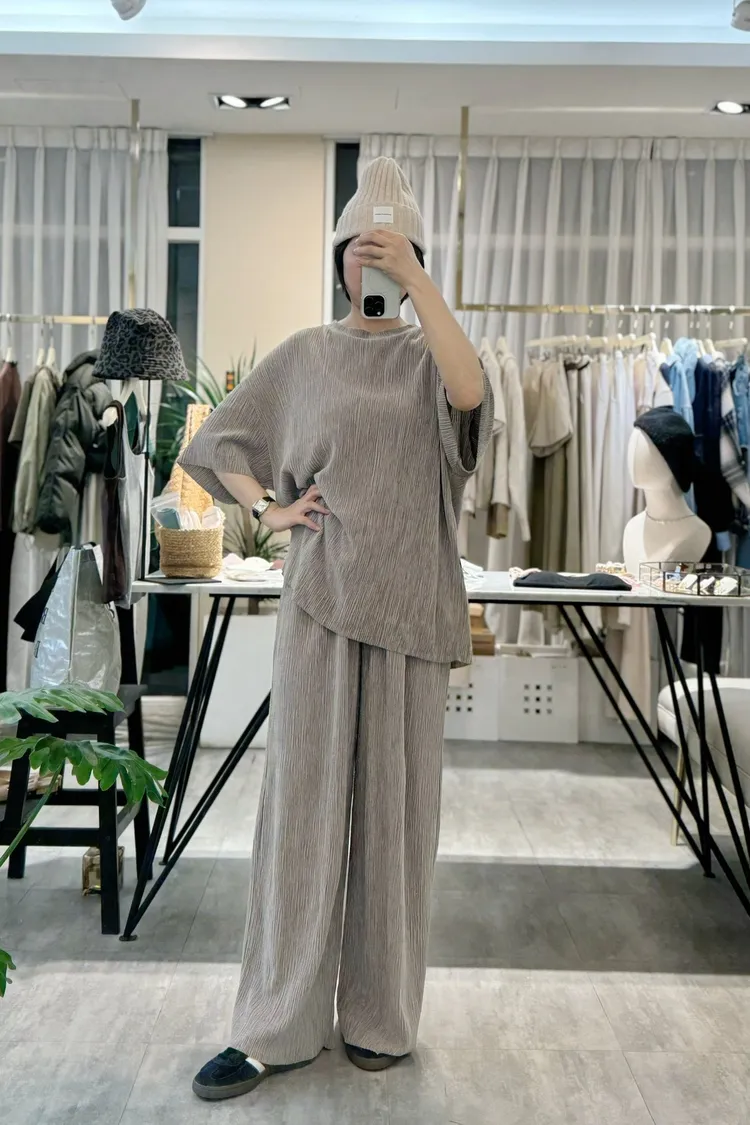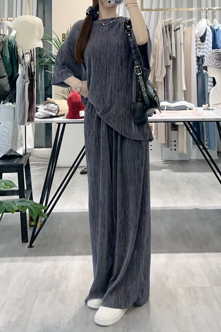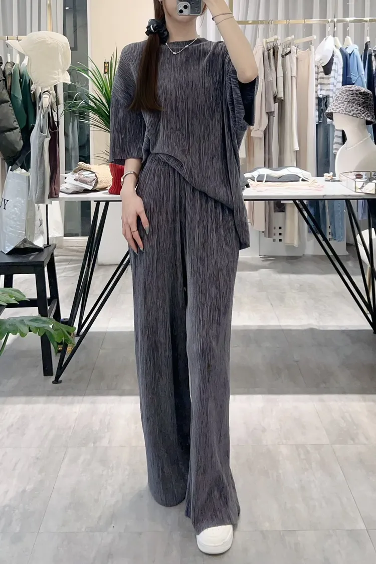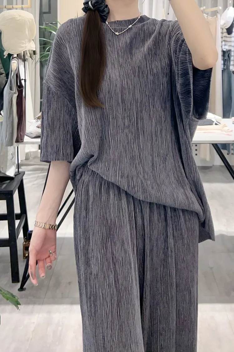 光澤感坑條短袖T+寬褲SET