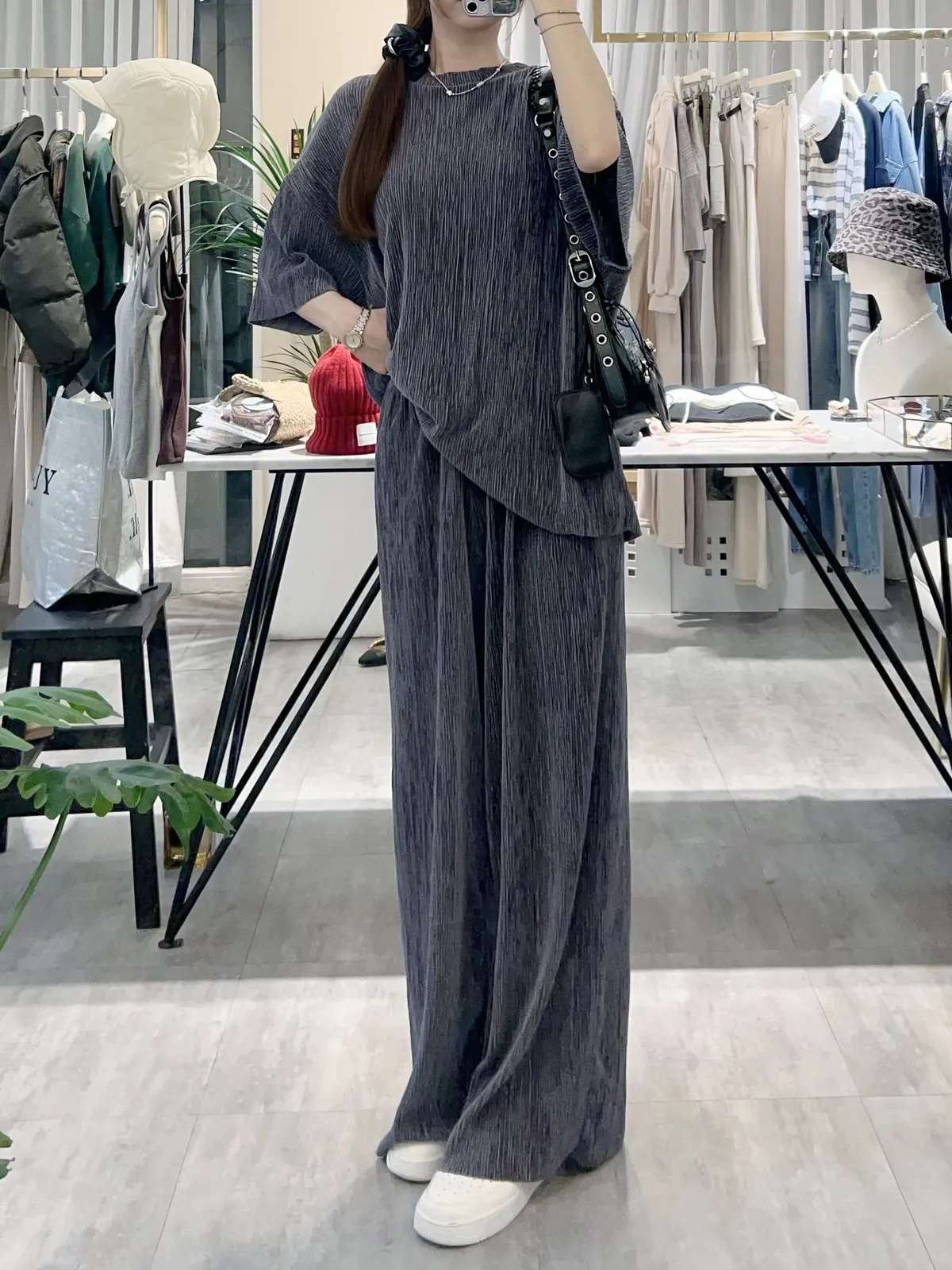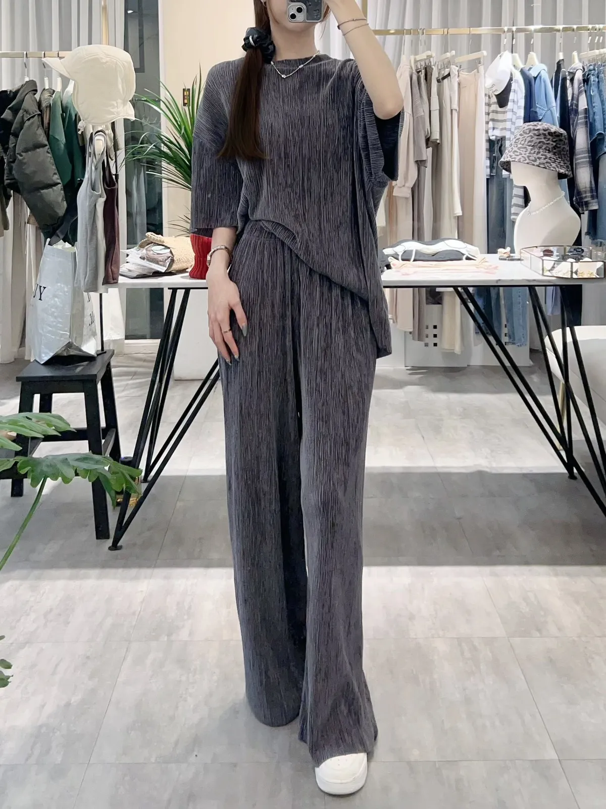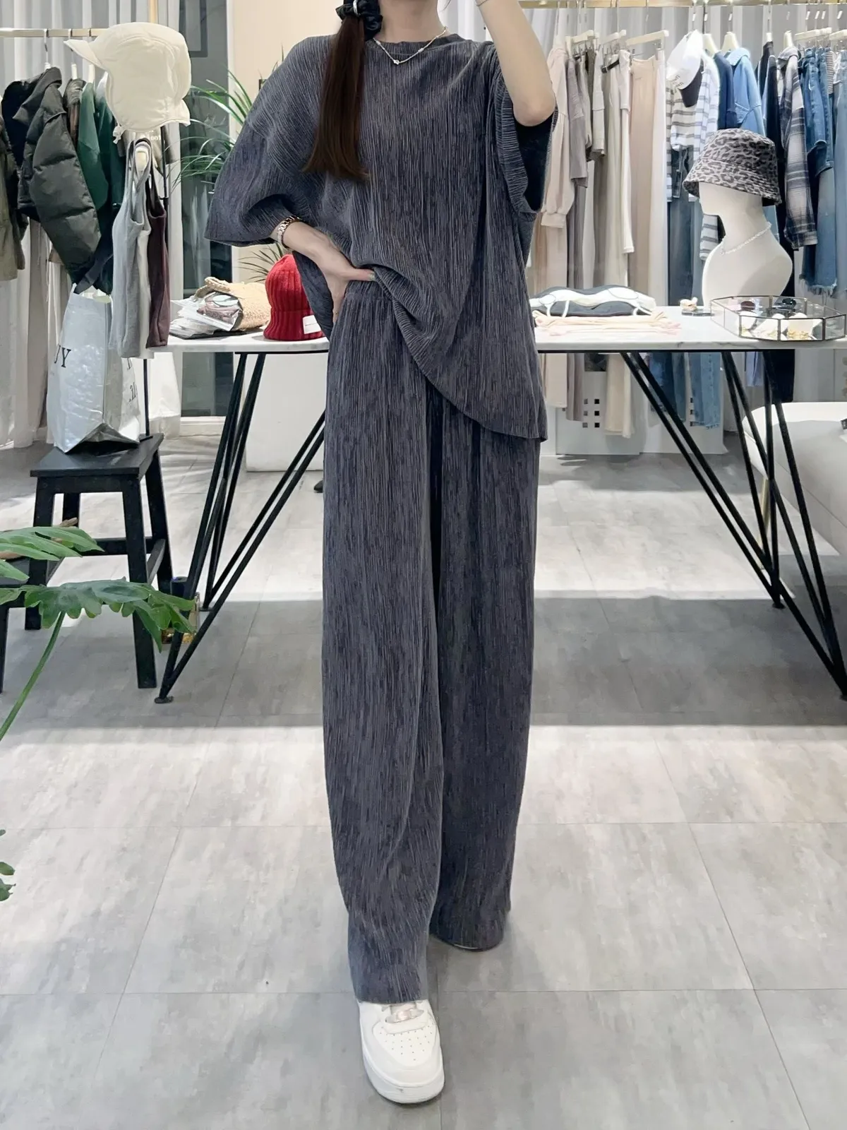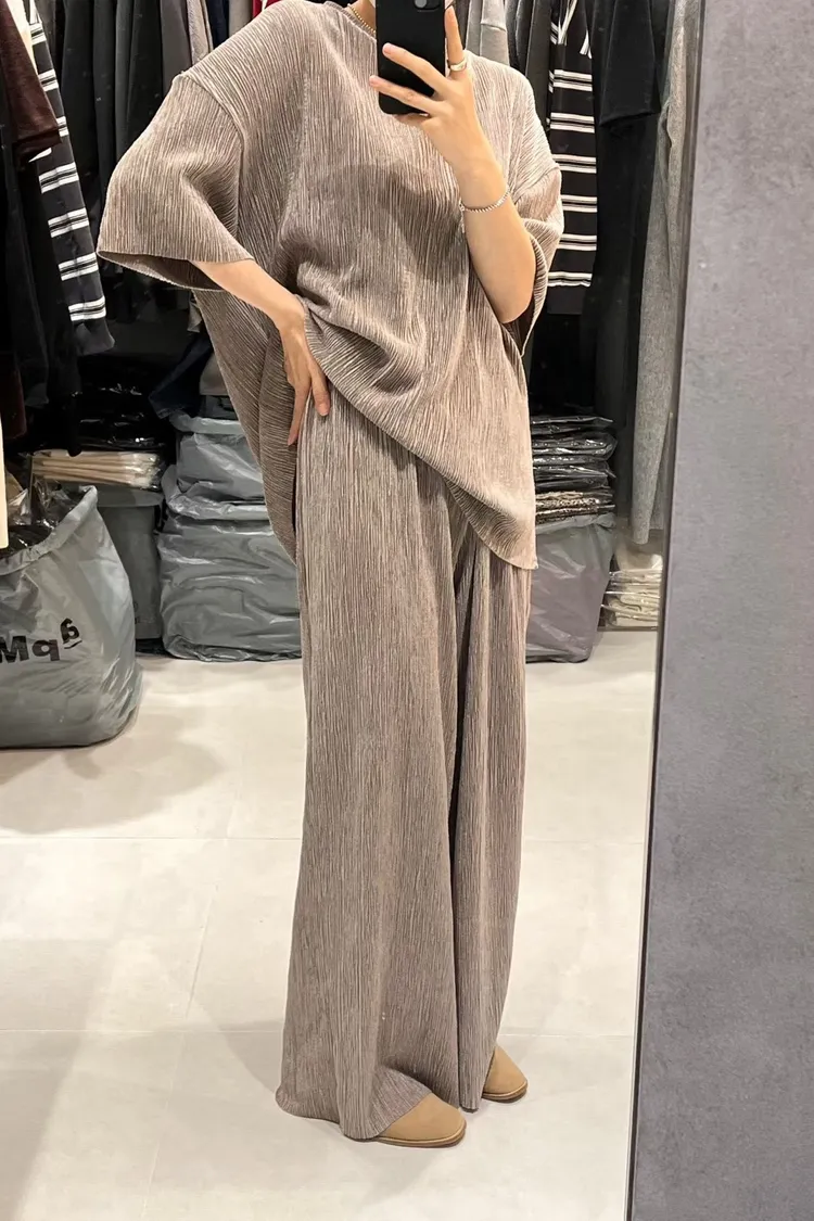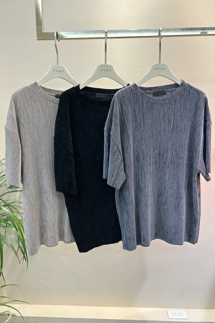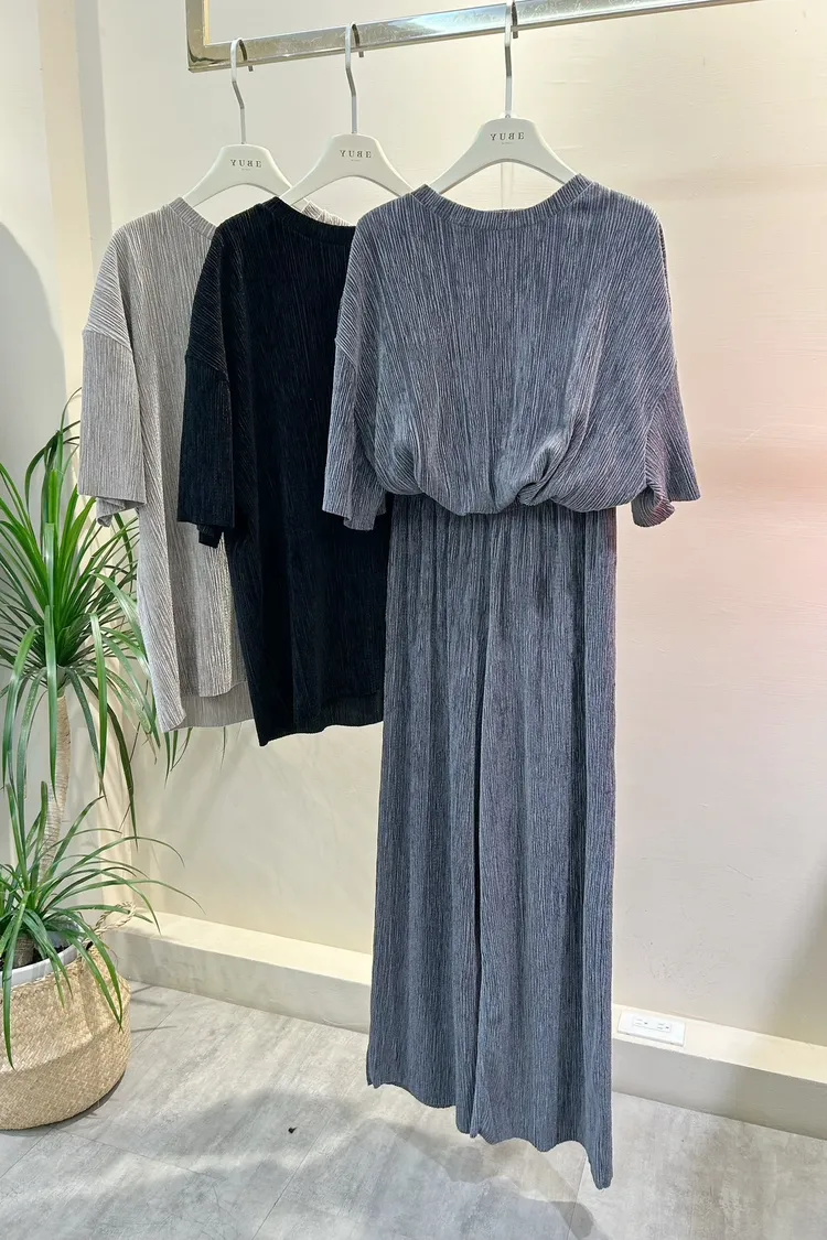 光澤感坑條短袖T+寬褲SET