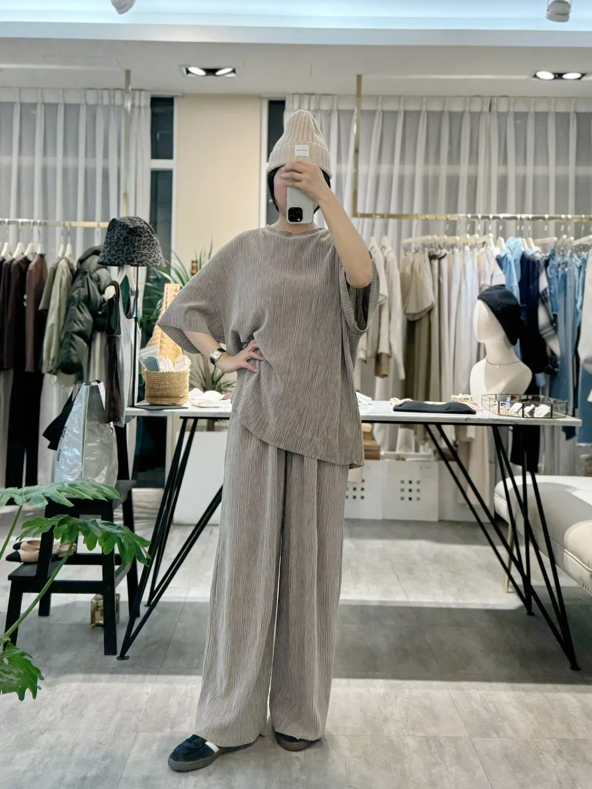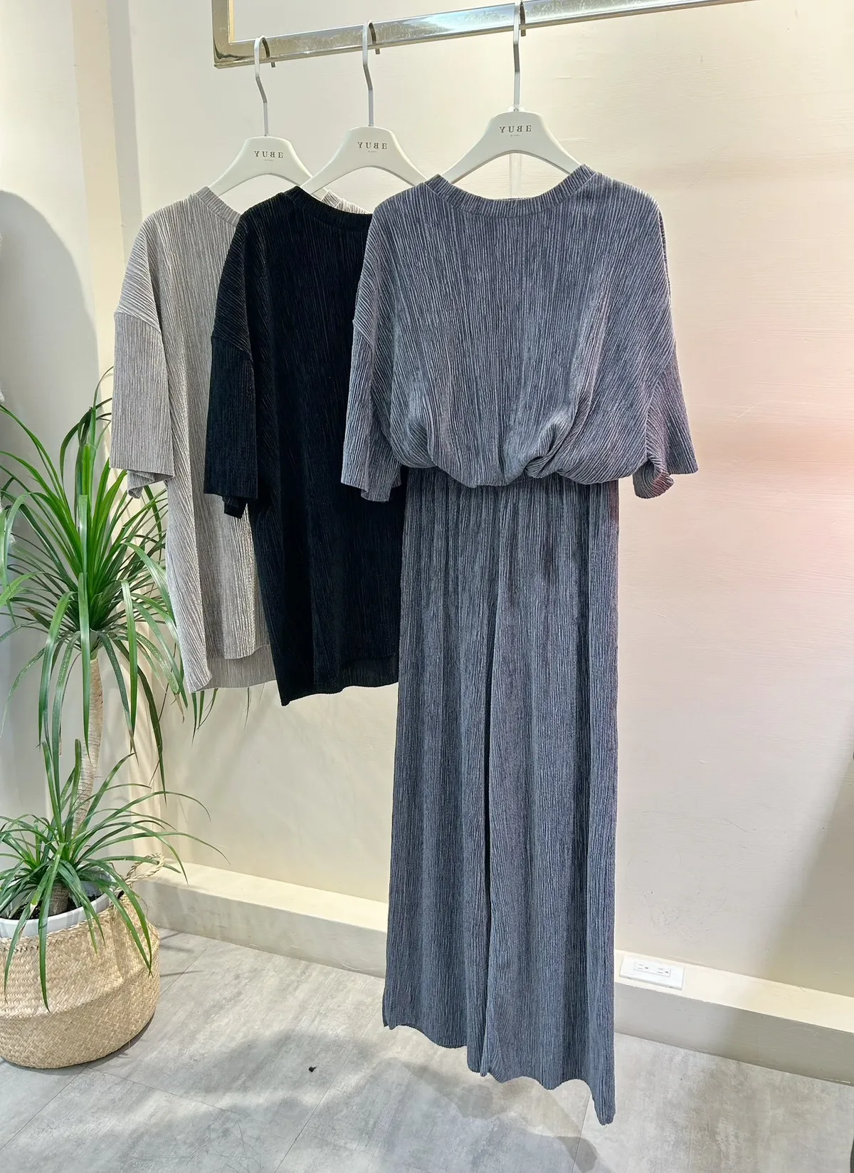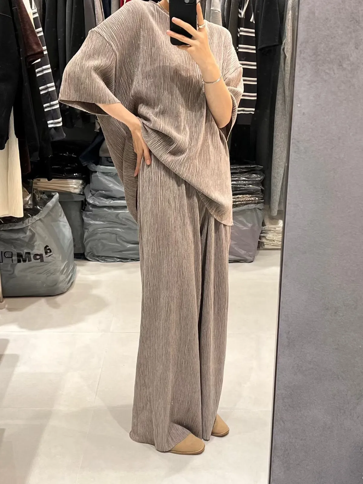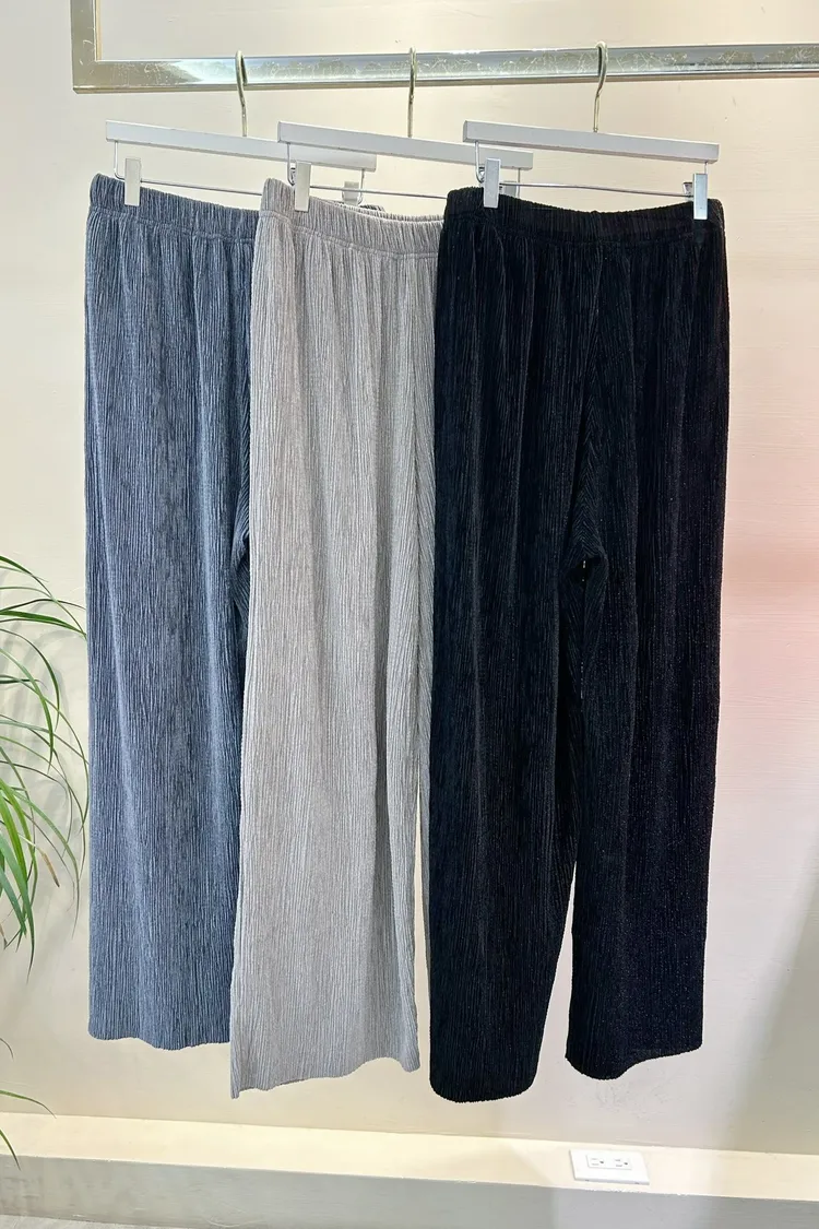 光澤感坑條短袖T+寬褲SET