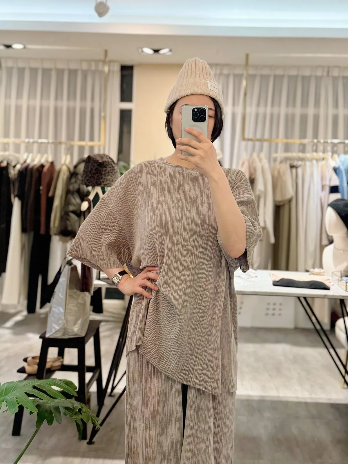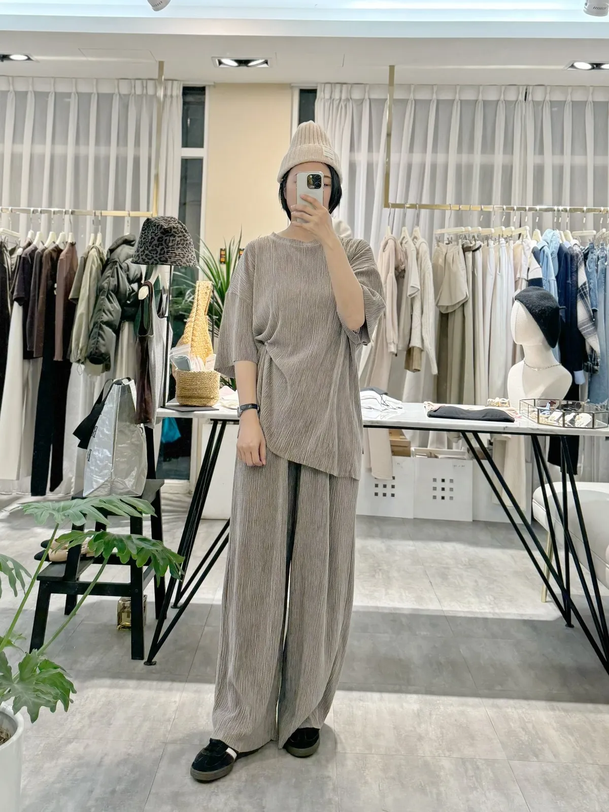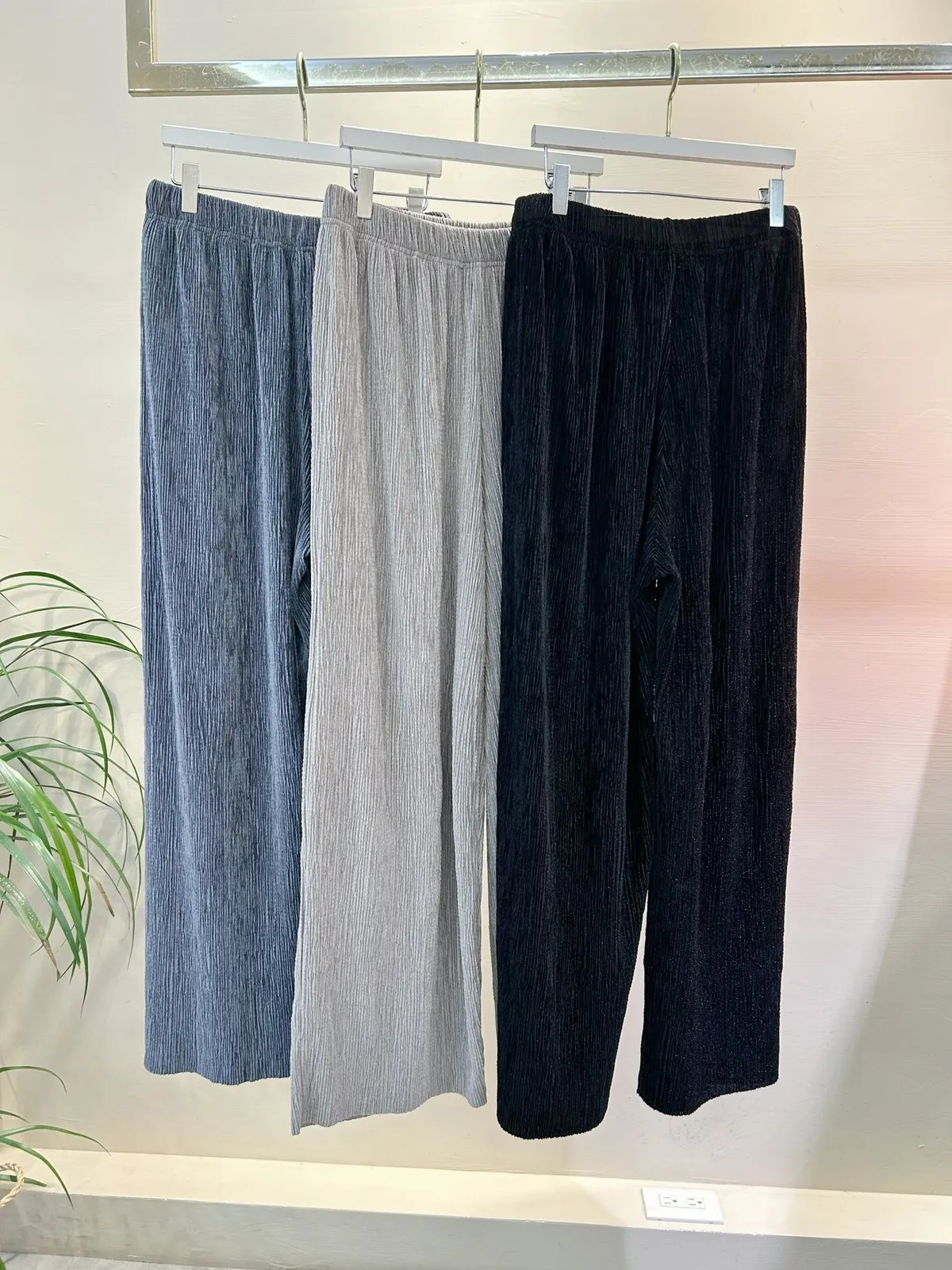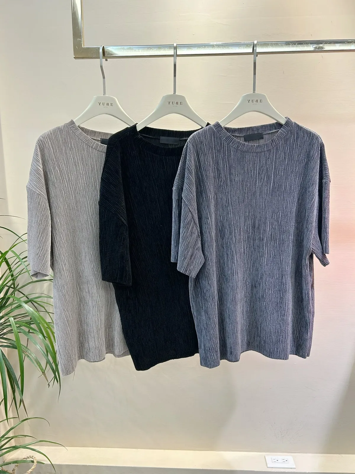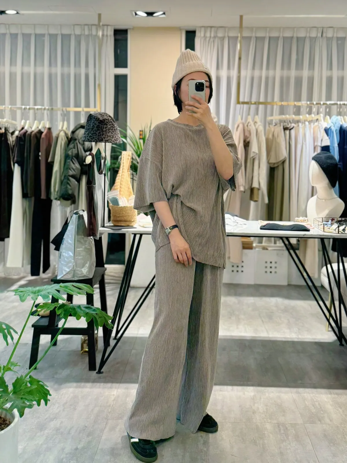 光澤感坑條短袖T+寬褲SET