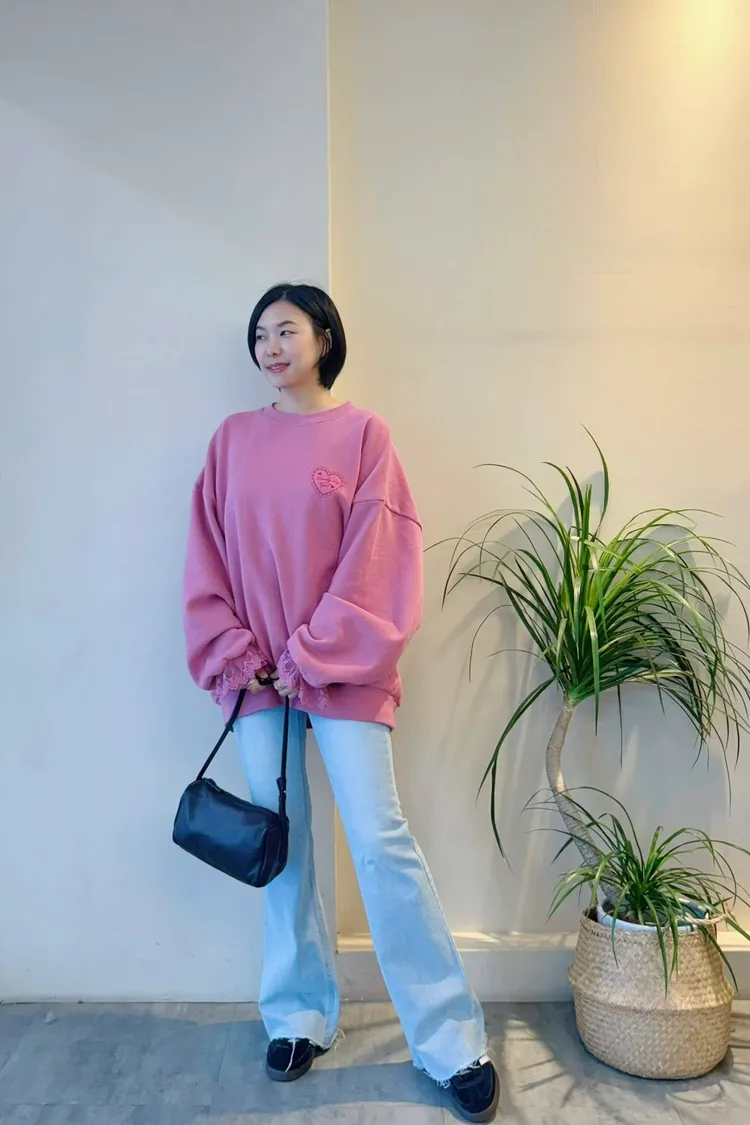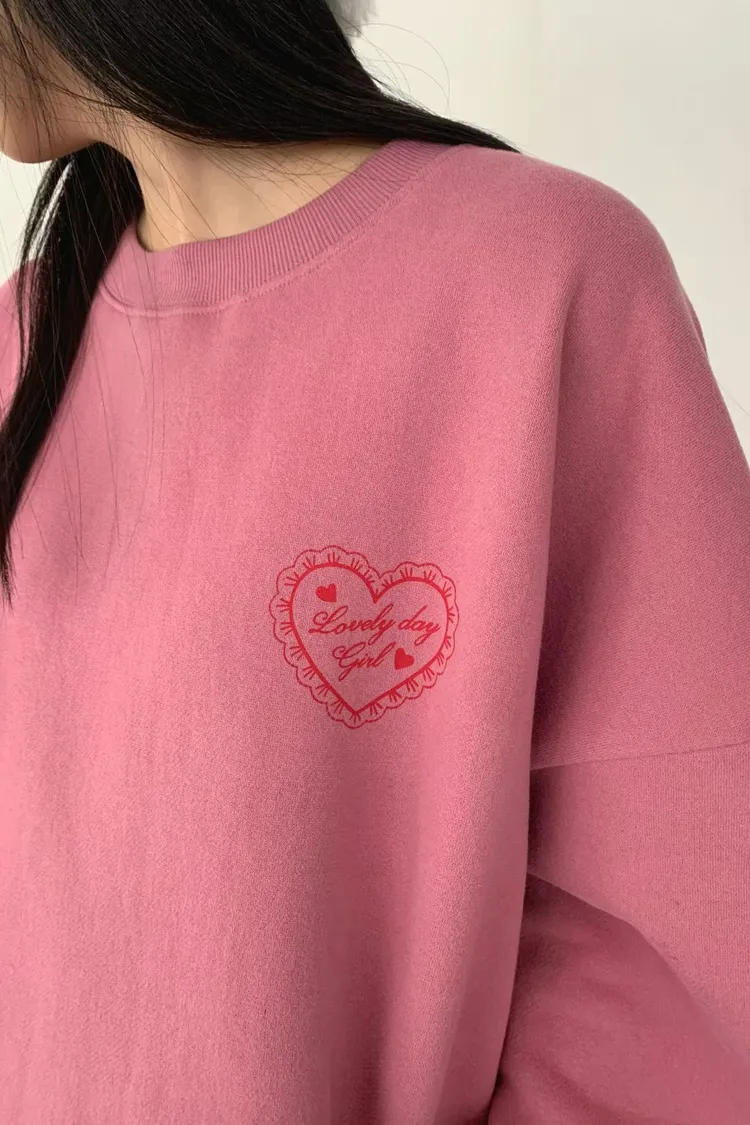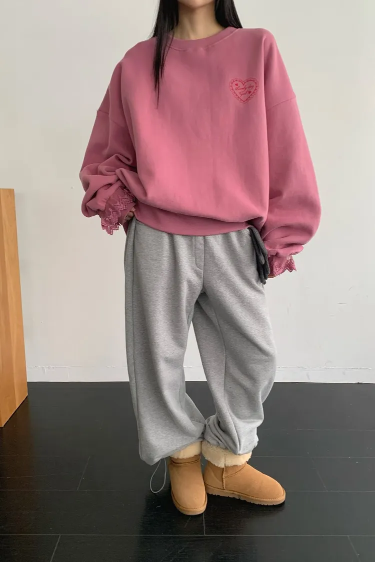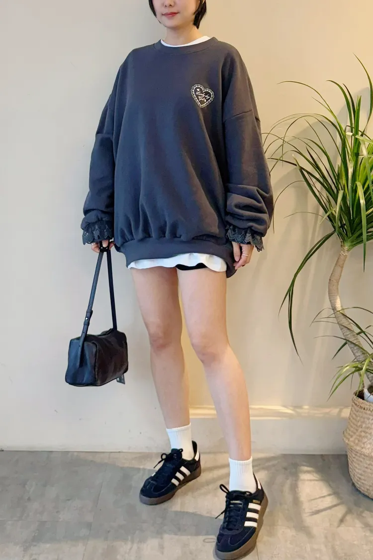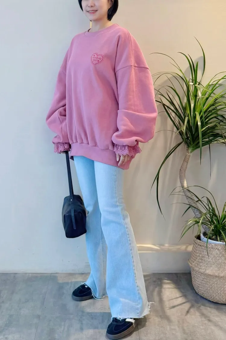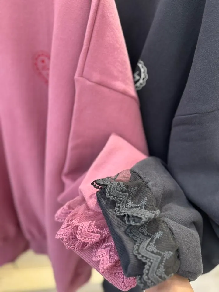 愛心印圖 蕾絲袖口造型大學T