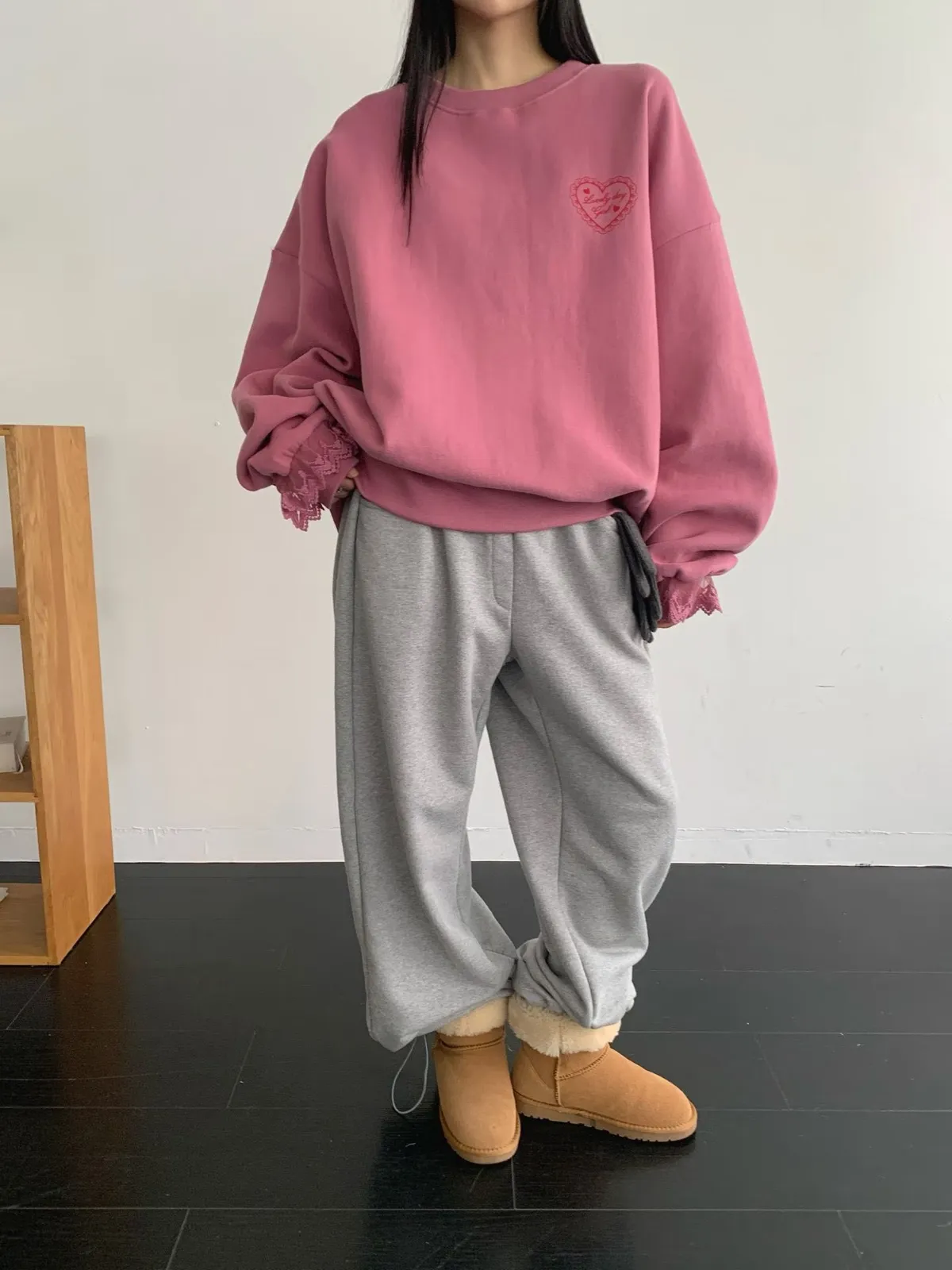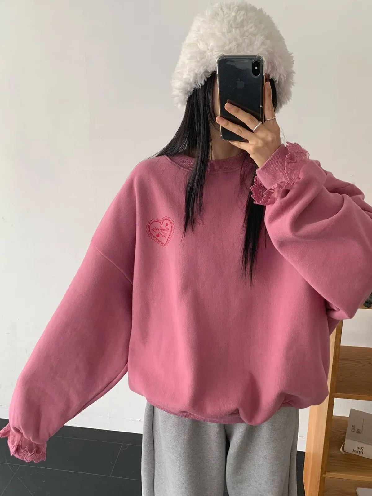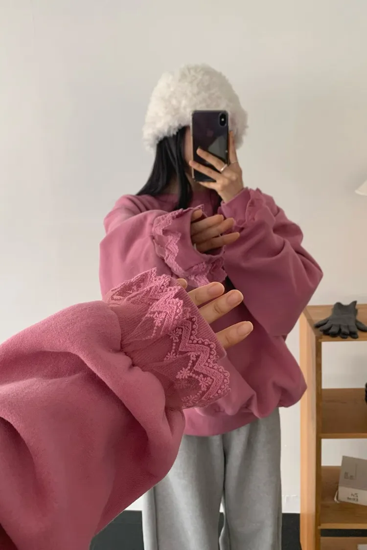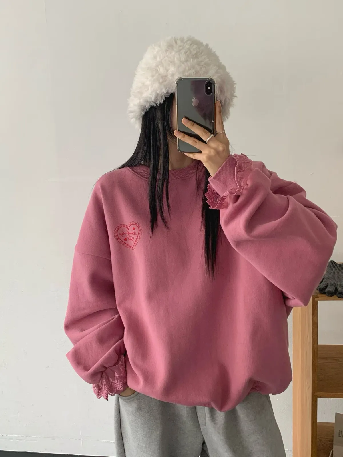 愛心印圖 蕾絲袖口造型大學T