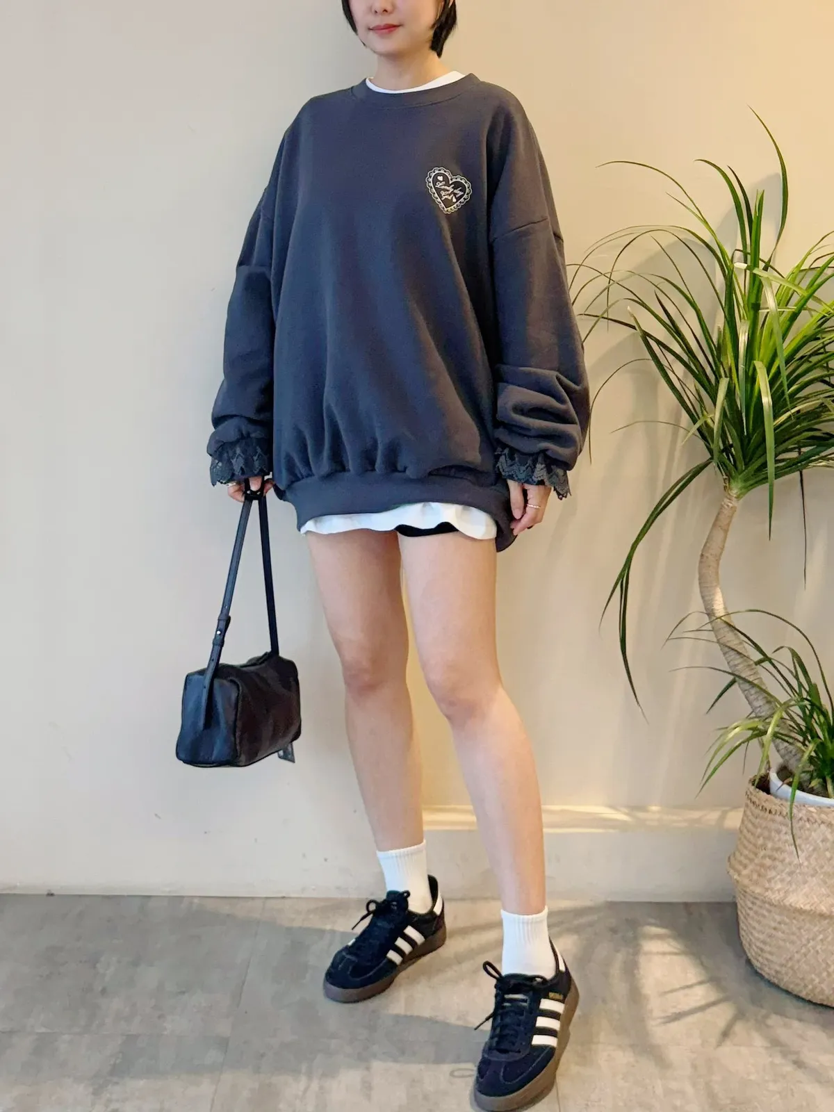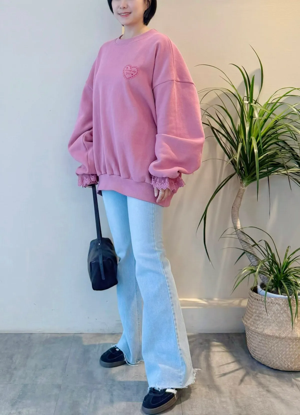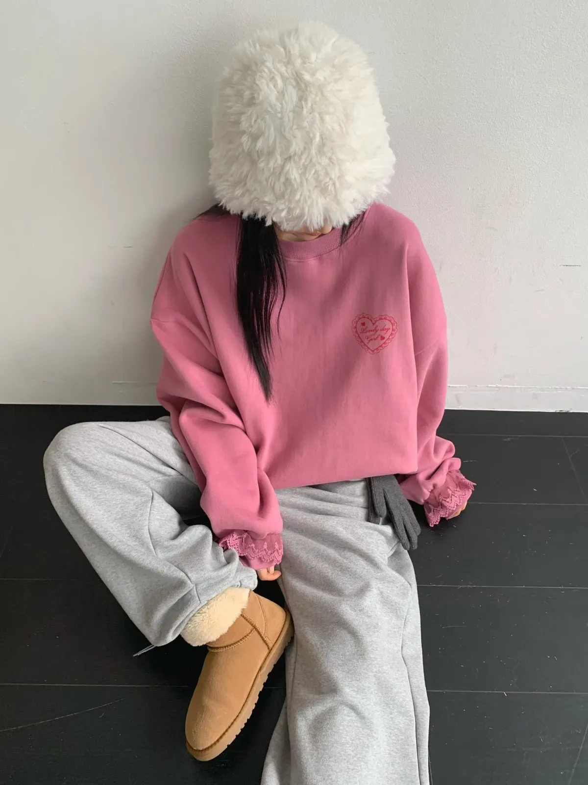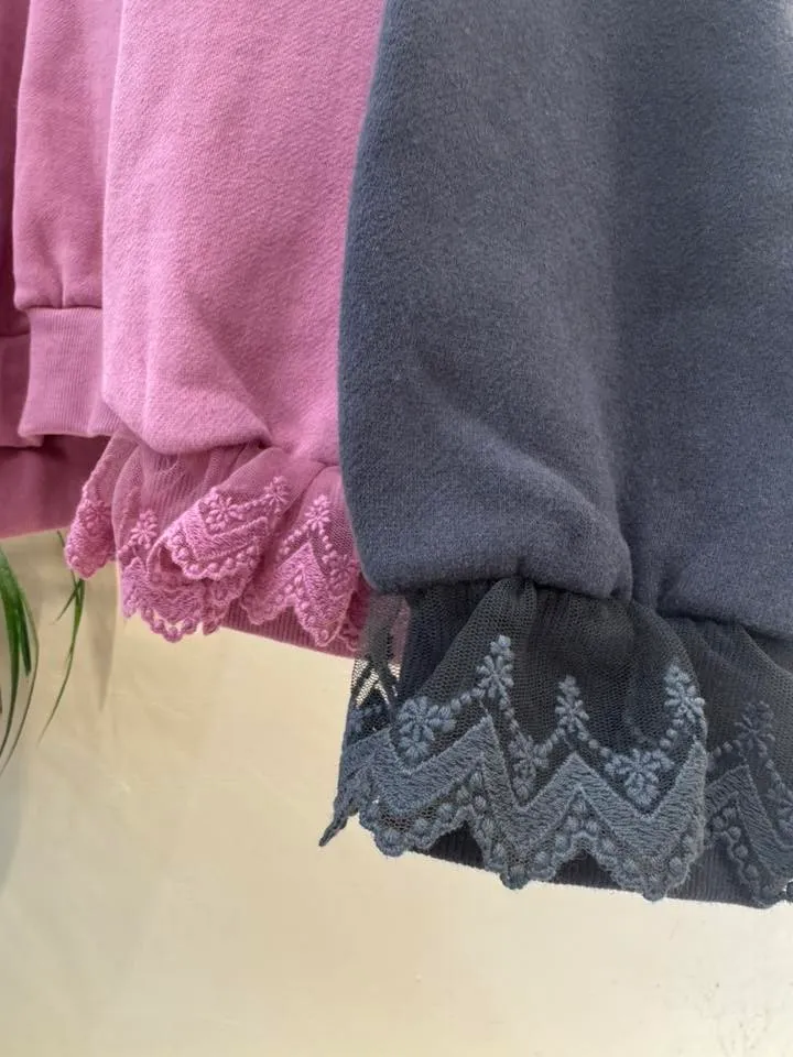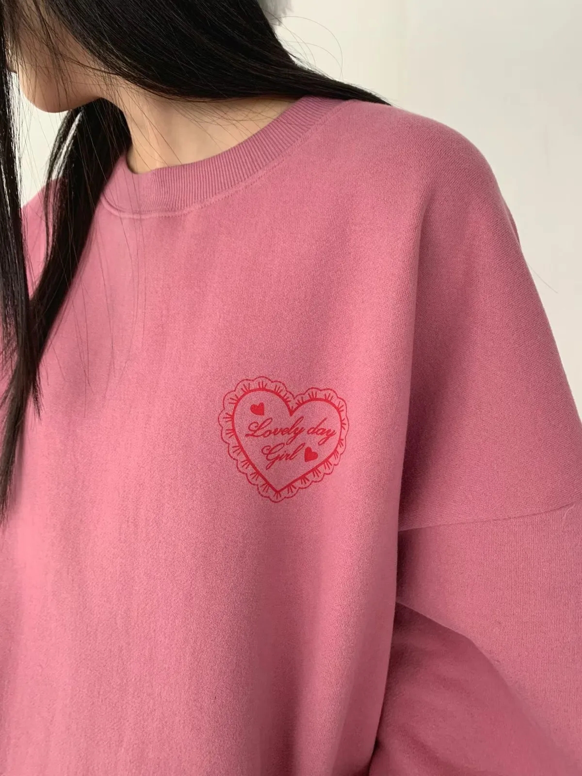 愛心印圖 蕾絲袖口造型大學T