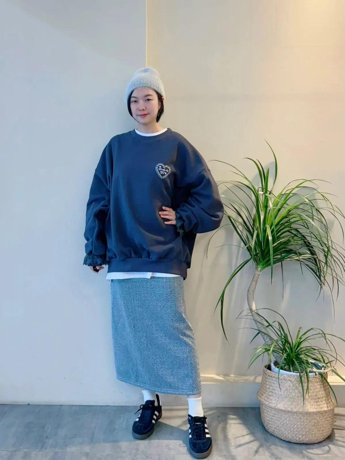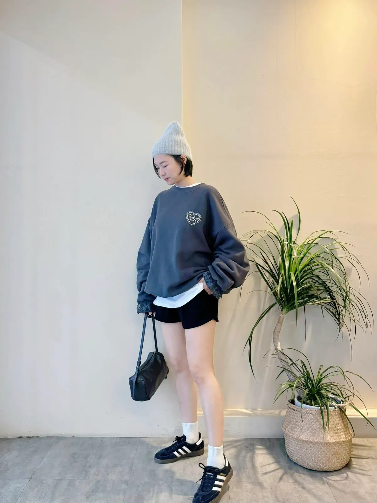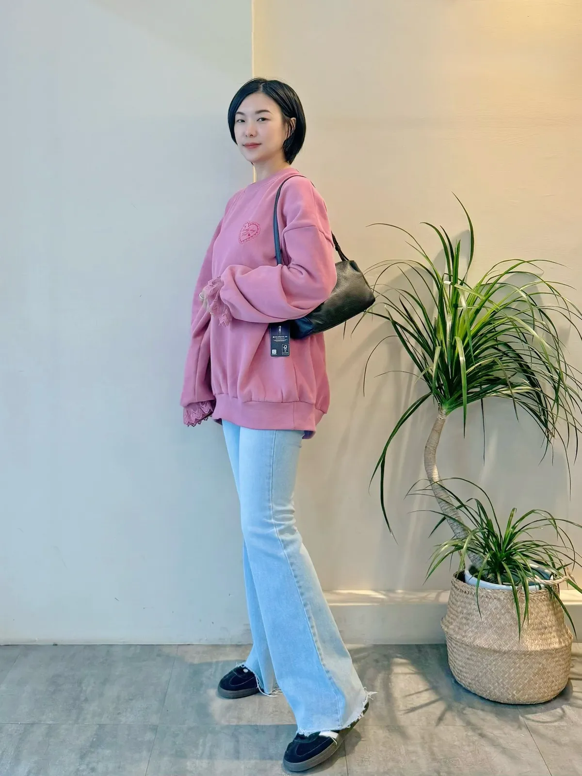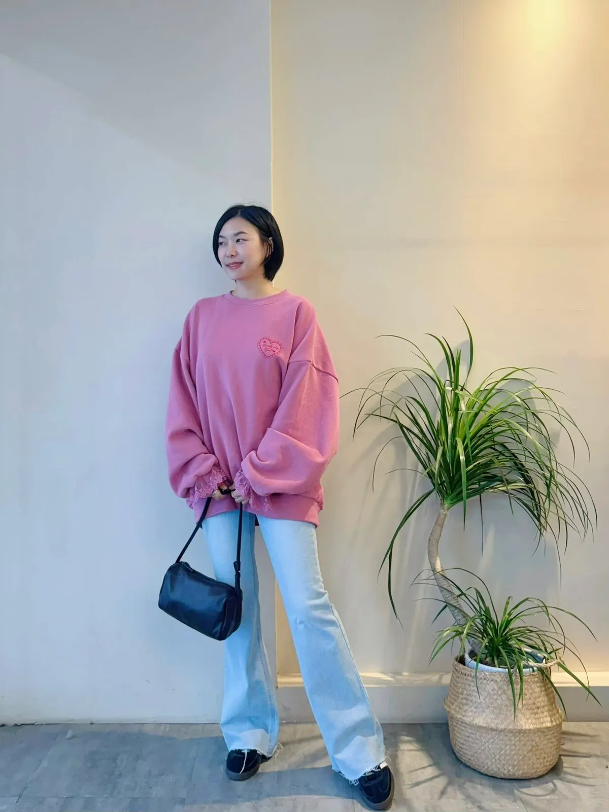 愛心印圖 蕾絲袖口造型大學T