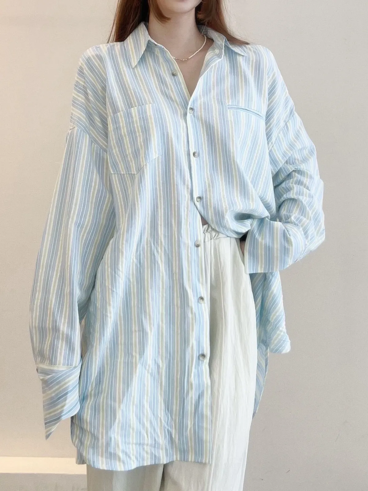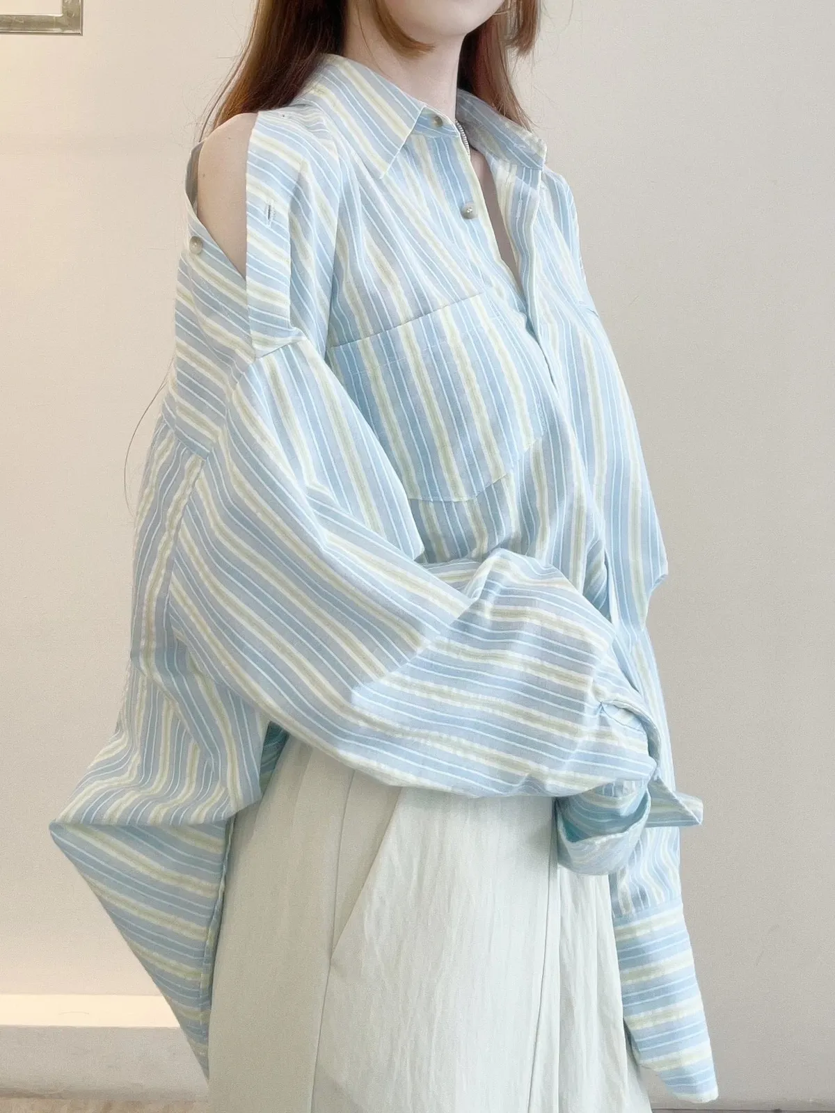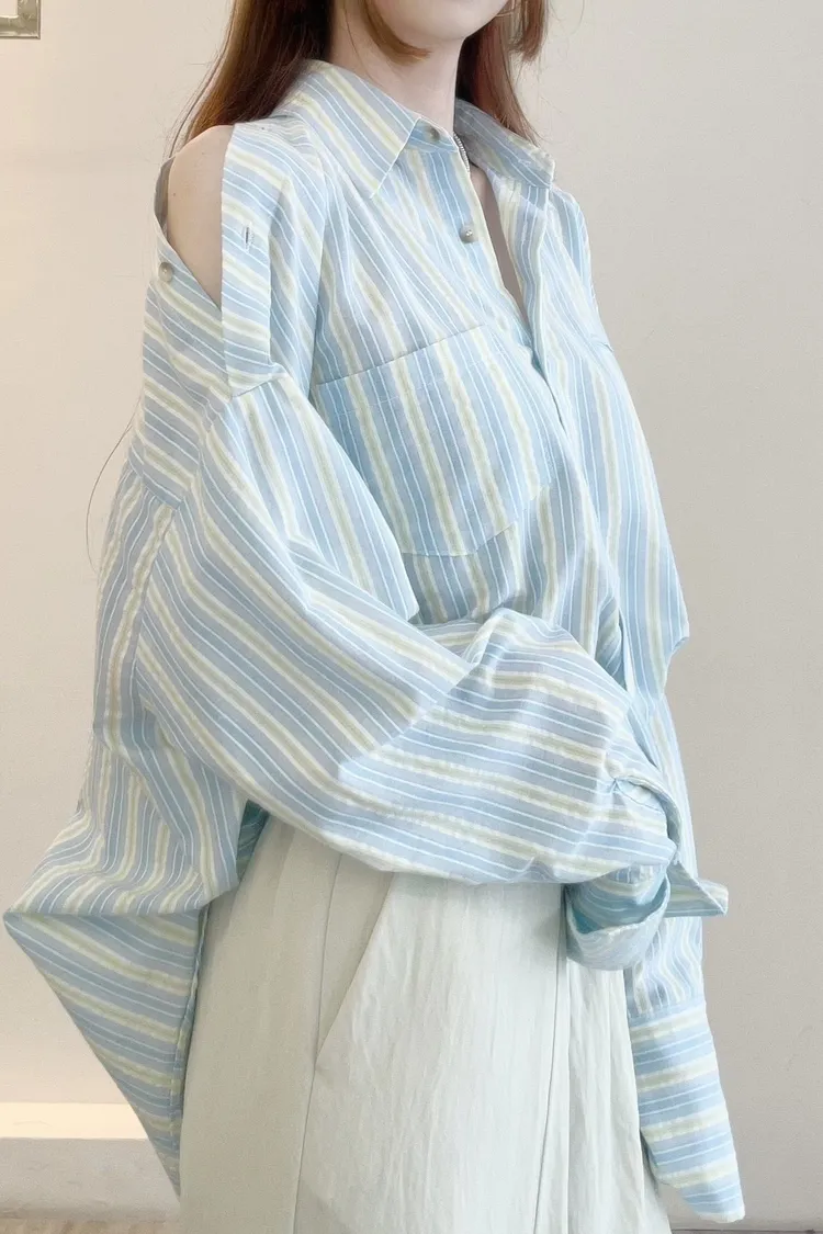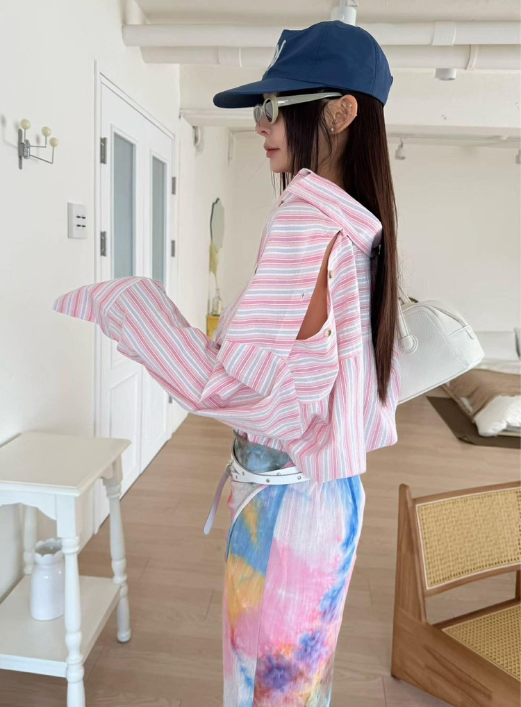 選用輕薄透氣的襯衫面料穿著清爽,適合春夏季節直紋設計增添俐落層次展現自然慵懶氛圍袖子開洞造型細節為整體造型注入獨特亮點粉/綠兩色 清新亮麗輕鬆點亮春日穿搭可作為罩衫外搭打造清爽又耐看的日常造型材質:聚脂纖維顏色:綠/粉