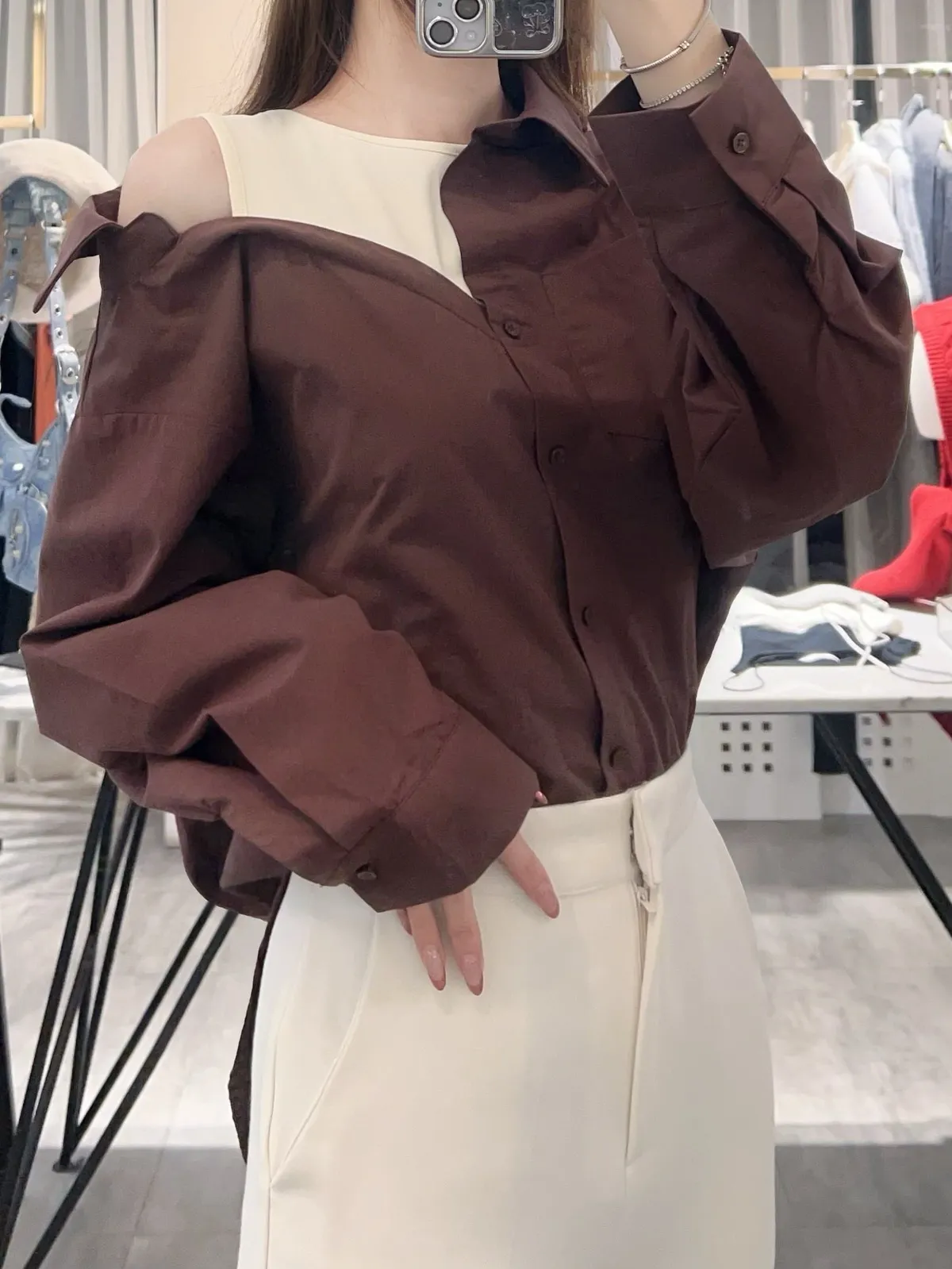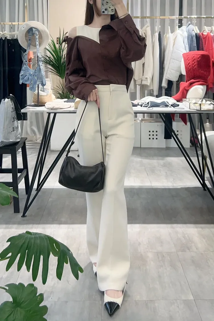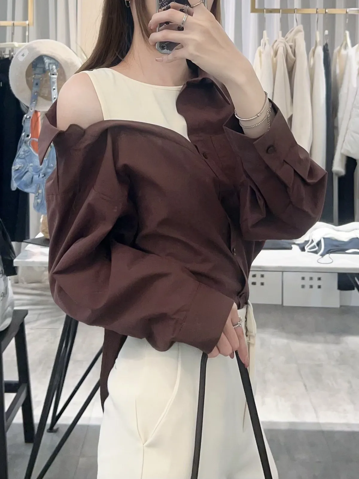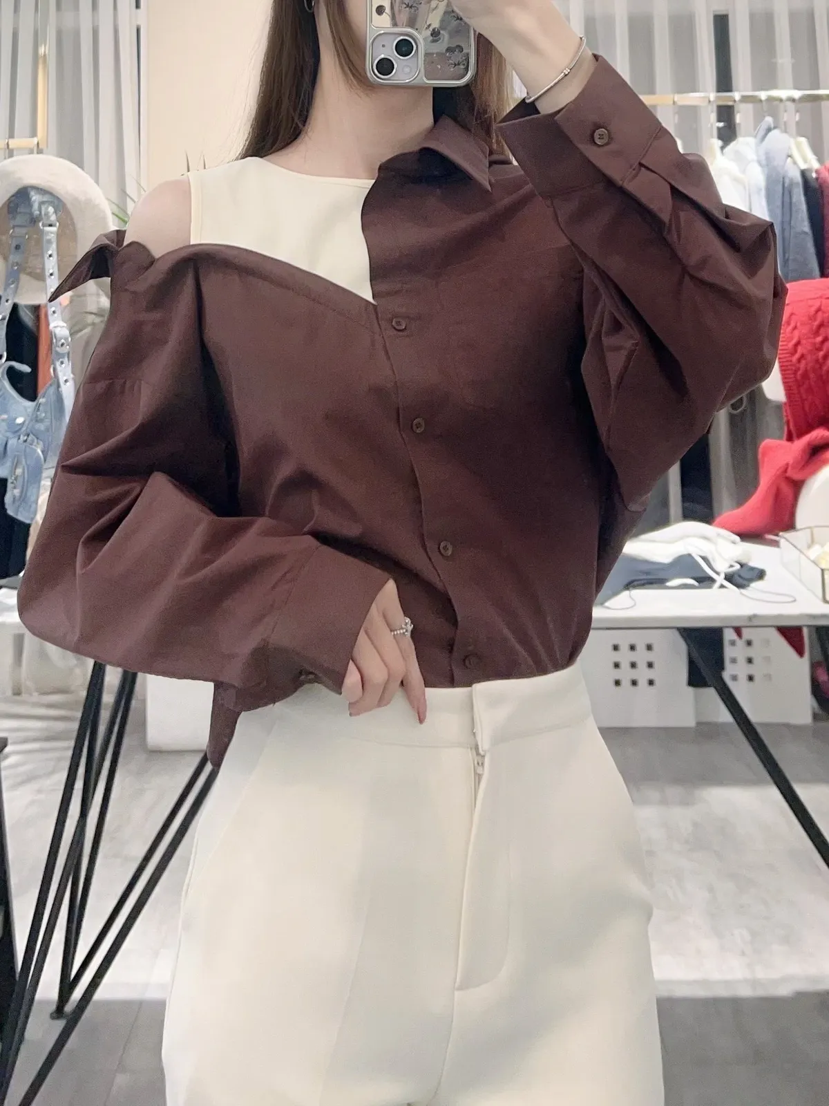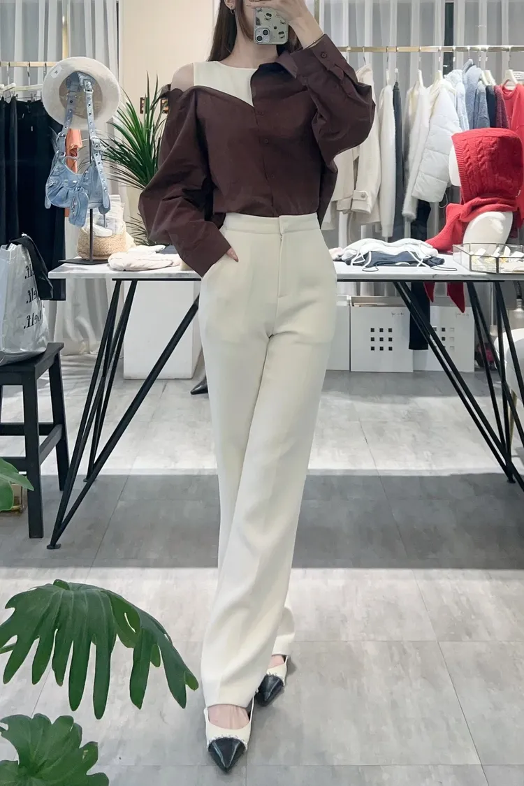 襯衫也是薄款有挺度,不對稱造型