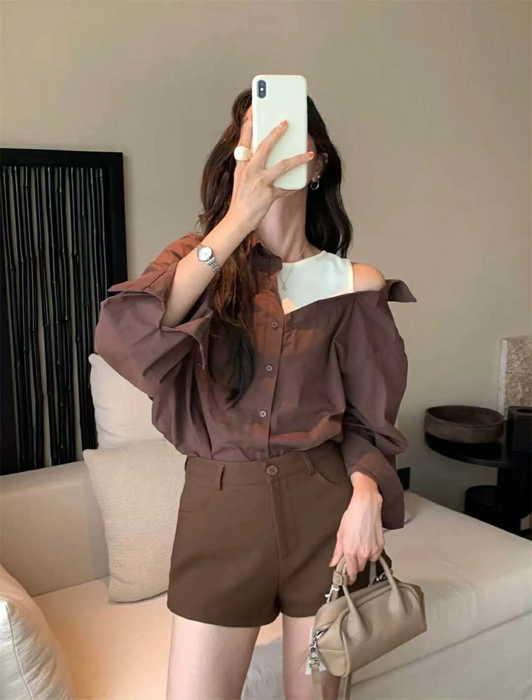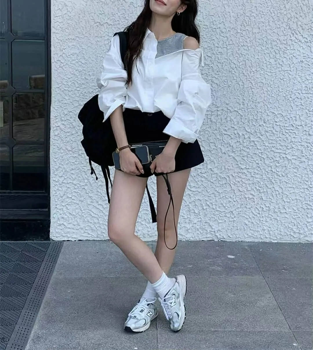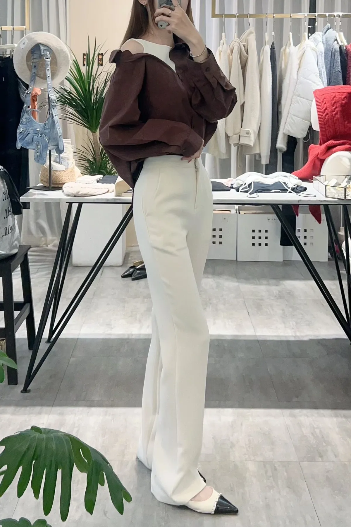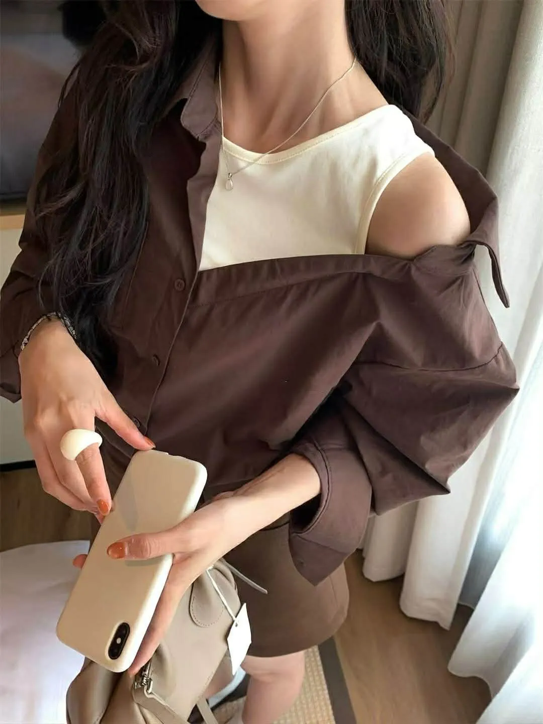 襯衫也是薄款有挺度,不對稱造型